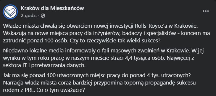 Cała ta narracja o „propagandzie sukcesu rodem z PRL” jest jak porównywanie jabłek do zwolnień grupowych. PRL polegał na tym, że państwo udawało, że wszystko kontroluje. Gibałowcy robią dokładnie to samo, tylko w wersji facebookowej: udają, że miasto odpowiada za wszystko, od Rolls-Royce’a po zwolnienia w korpo.