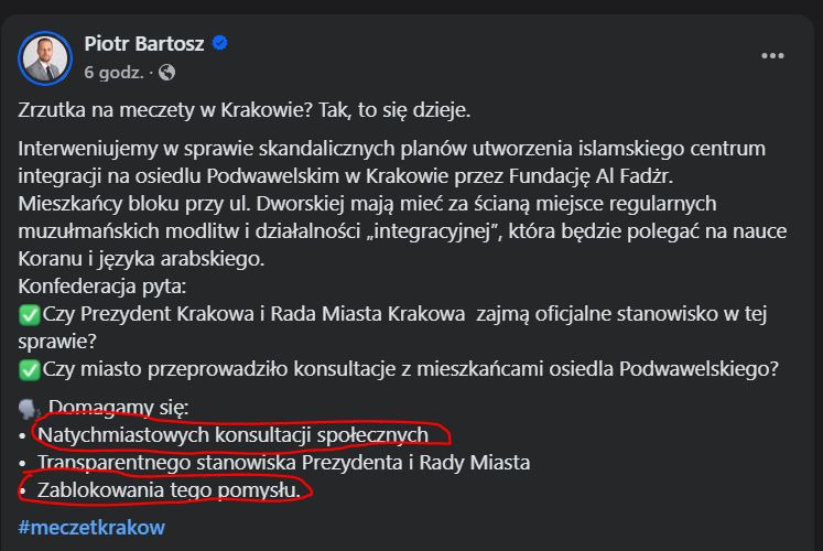 Teraz jest podobnie. W Krakowie ma powstać meczet. Nie rozstrzygamy tu, czy to dobrze, czy źle. Ponoć ma powstać. Na scenę wkracza jednak Konfederacja, cała na biało (choć najczęściej w ciemnych barwach katastrofy cywilizacyjnej), i ogłasza stanowczo: