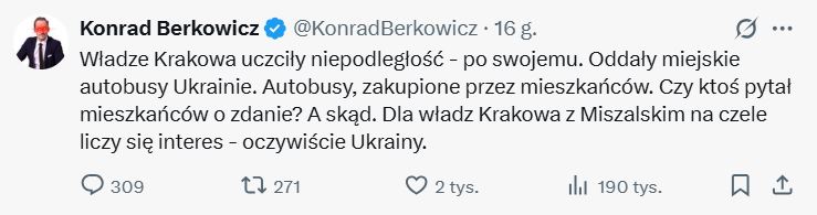 Pisze, że władze Krakowa “po swojemu” uczciły niepodległość, oddając autobusy Ukrainie. Że nikt nie pytał mieszkańców o zdanie. Że to niby “interes Ukrainy”, a nie Krakowa.