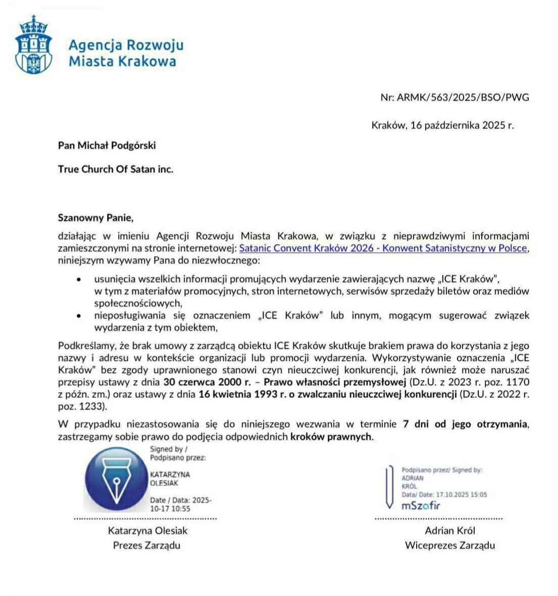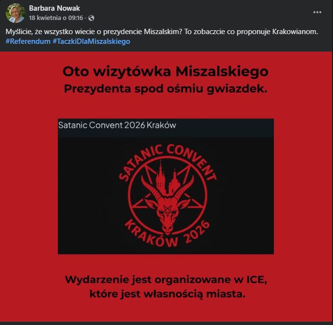 Bo fakty są kompromitująco banalne: ICE Kraków nie organizuje żadnego „zlotu satanistów”. Nie ma wydarzenia, nie ma umowy, nie ma tematu. Jest dementi. Twarde, jednoznaczne i kompletnie ignorowane przez tych, którzy już zdążyli odpalić emocjonalną machinę.