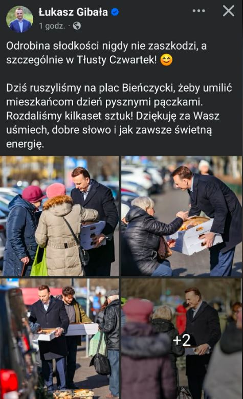 W Tłusty Czwartek, kiedy naród tonie w lukrze, a cholesterol rośnie szybciej niż sondaże w PowerPoincie, na ulice Krakowa wyruszył on – Łukasz Gibała. Z przylepionym uśmiechem numer 74 (bo poprzednie 73 najwyraźniej nie przeszły focusów) rozdawał mieszkańcom pączki. Kampania wyborcza trwa więc w najlepsze. A raczej: w najsłodsze.