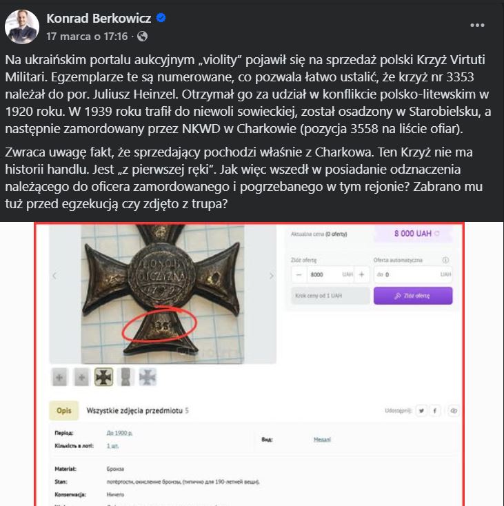 Schemat jest znajomy: szybki wpis, mocne oskarżenia, zero weryfikacji. „Patrzcie, Polacy! Nasz order z Katynia na ukraińskiej aukcji!” – przekaz prosty, chwytliwy i idealnie skrojony pod emocje. Bo przecież temat Katynia nie wymaga dodatkowego podkręcania – wystarczy go dotknąć, by wywołać reakcję.