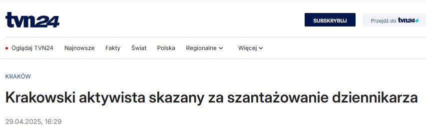 Potem TVN24 – cały kraj ogląda: Krakowski aktywista skazany za szantażowanie dziennikarza