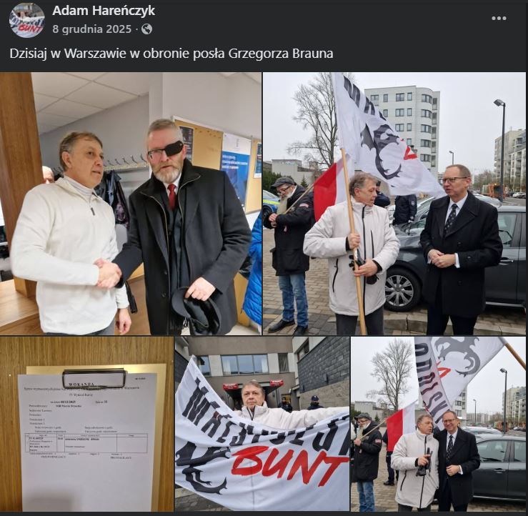 Przeglądając media społecznościowe Hareńczyka, nietrudno zauważyć, że politycznie najbliżej mu do Grzegorza Brauna. To z nim fotografuje się często i chętnie. Jeździł nawet do Warszawy, by go bronić.