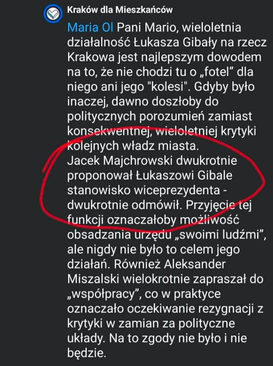 Jest wpis na Facebooku, w którym Gibała osobiście zarzeka się, że nie zależy mu na byciu wiceprezydentem. Ponoć dostał nawet taką propozycję od Majchrowskiego i jej nie przyjął.